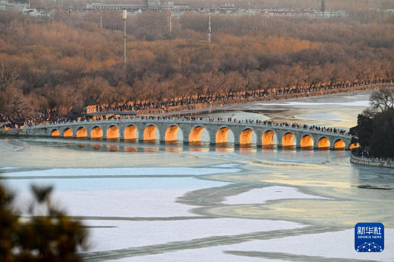 12月21日是冬至节气,北京颐和园十七孔桥的“金光穿洞”景观吸引了众多游客与摄影爱好者观赏拍摄。