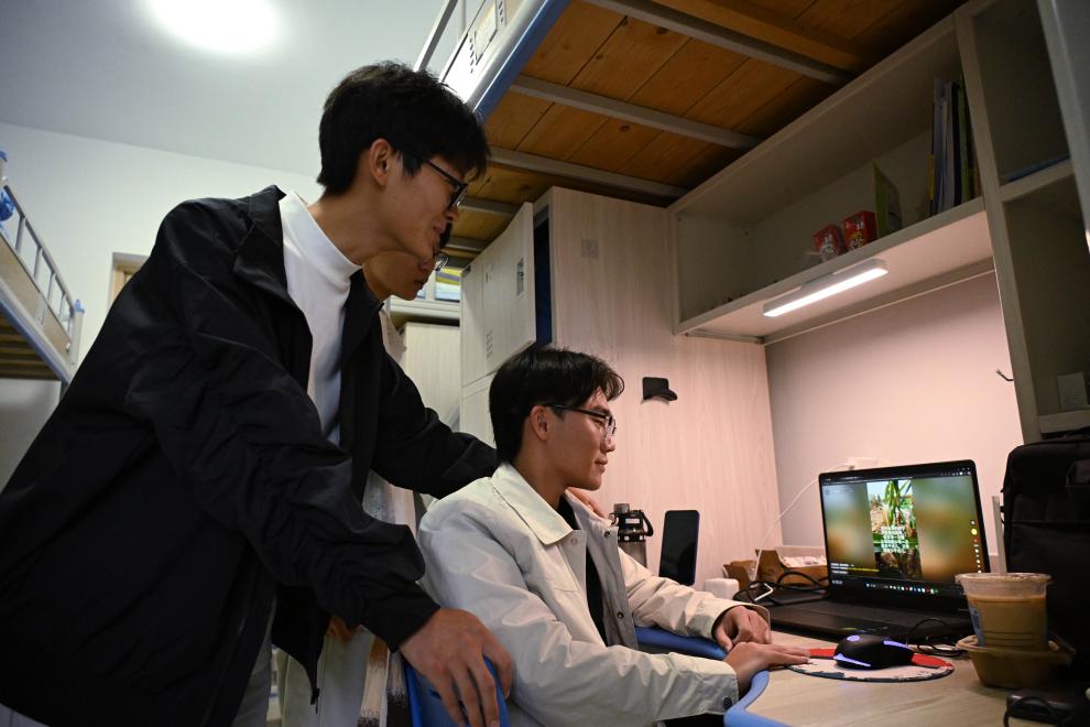 在青岛农业大学学生宿舍,孟成(左)向室友介绍自己之前发布的在地里干活的视频(2025年10月11日摄)。新华社记者 李紫恒 摄