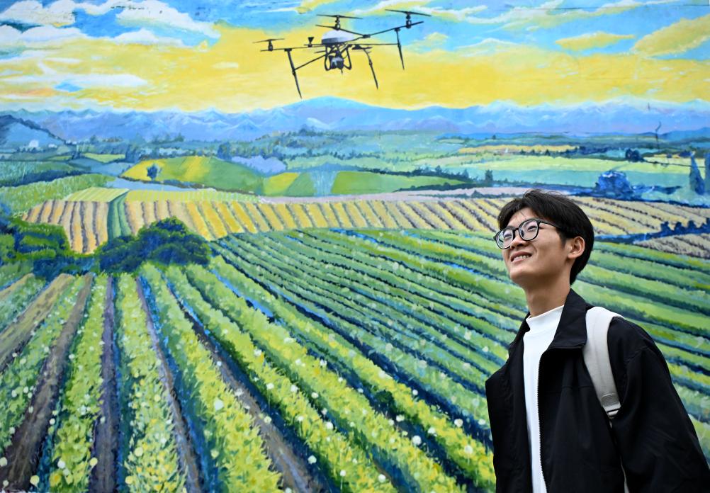 孟成从青岛农业大学校园内一处大型乡村振兴主题墙绘前经过(2025年10月11日摄)。新华社记者 李紫恒 摄