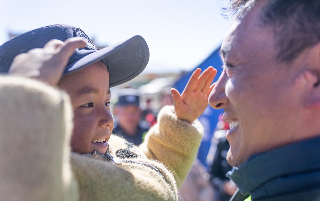 在定日县长所乡嘎布村,一名小朋友戴上移民警察米玛次仁的帽子敬礼(2025年1月14日摄)。新华社记者 丁增尼达 摄