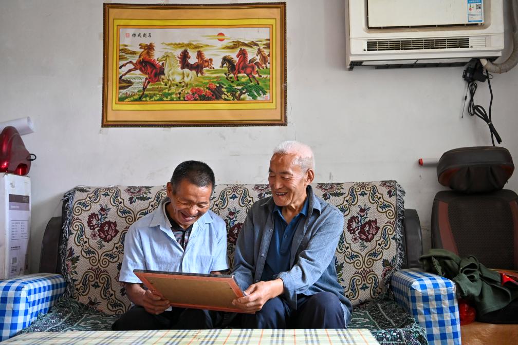 在山西省平顺县东寺头乡黄崖沟自然村,黄崖沟村前村支书桑春玉(右)和秦海松一起观看家里的老照片(2025年8月27日摄)。