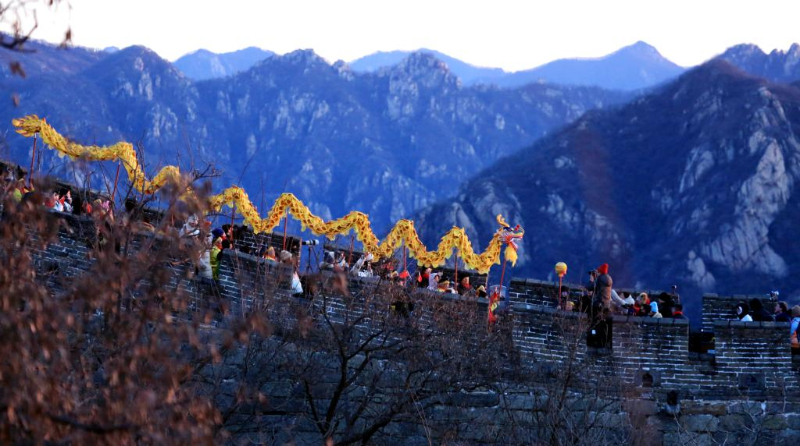 图为慕田峪长城上的舞龙舞狮表演。新华社发