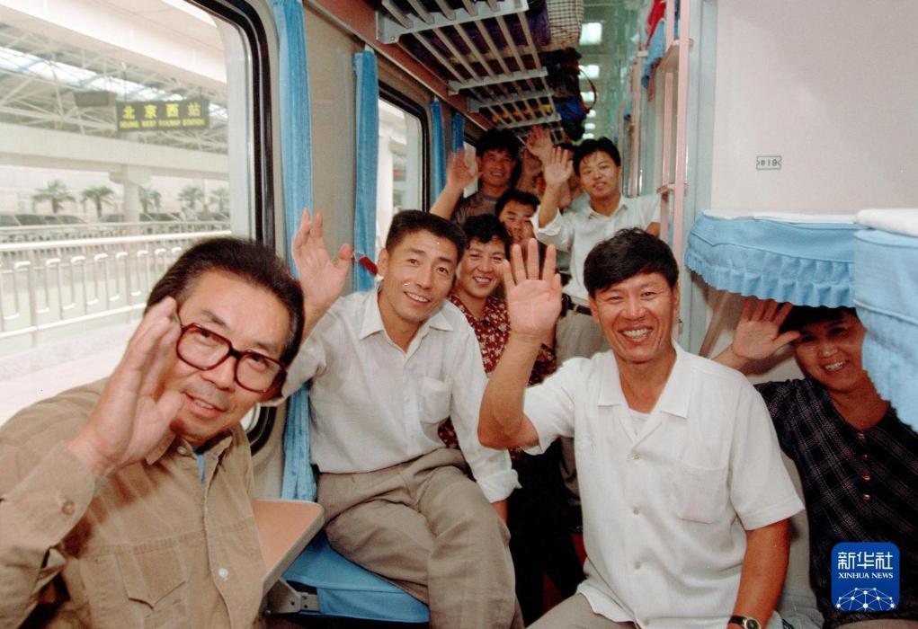 1996年9月1日,京九铁路全线开通,乘坐北京开往深圳的首列105次列车的旅客挥手告别。新华社记者 刘卫兵 摄