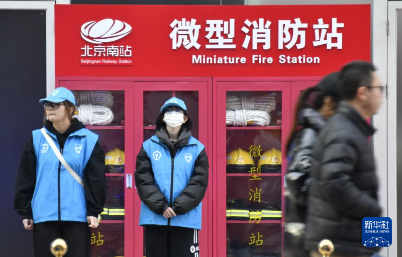 2月1日,志愿者在北京南站候车大厅内的消防服务站值守。