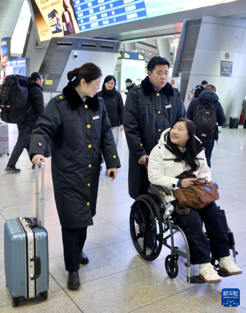 2月1日,北京南站的工作人员送一名脚部受伤的旅客上车。