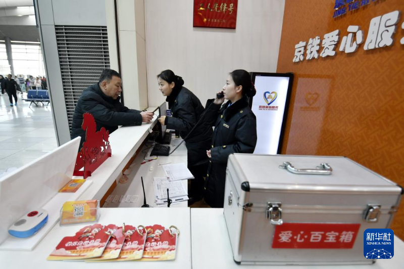 2月1日,北京南站爱心服务台的工作人员为旅客提供咨询服务。