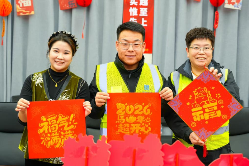 在书法创作和送福环节,书法名家研墨挥毫。笔走龙蛇间,苍劲有力的福字、对仗工整的春联跃然纸上。活动特设“心愿福字”登记台和互动体验区,书法名家根据建设者提前写好的心仪祝福语展开创作,职工在老师指导下手写福字,一张张大合影记录下建设者朴实真挚的笑容。