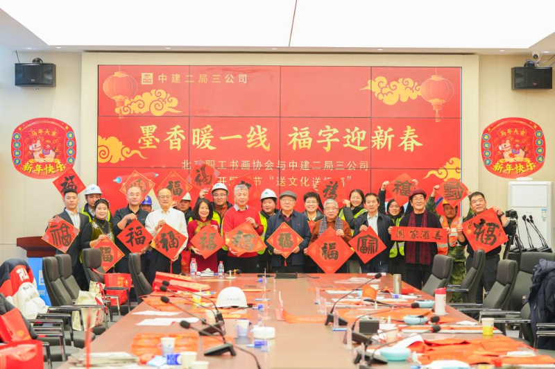 新华网北京2月12日电(记者张骁)11日下午,中建二局三公司与北京职工书画协会在中建二局大郊亭624项目现场举办“墨香暖一线 福字迎新春”文化活动,向新春前夕坚守岗位的广大建设者送上祝福。