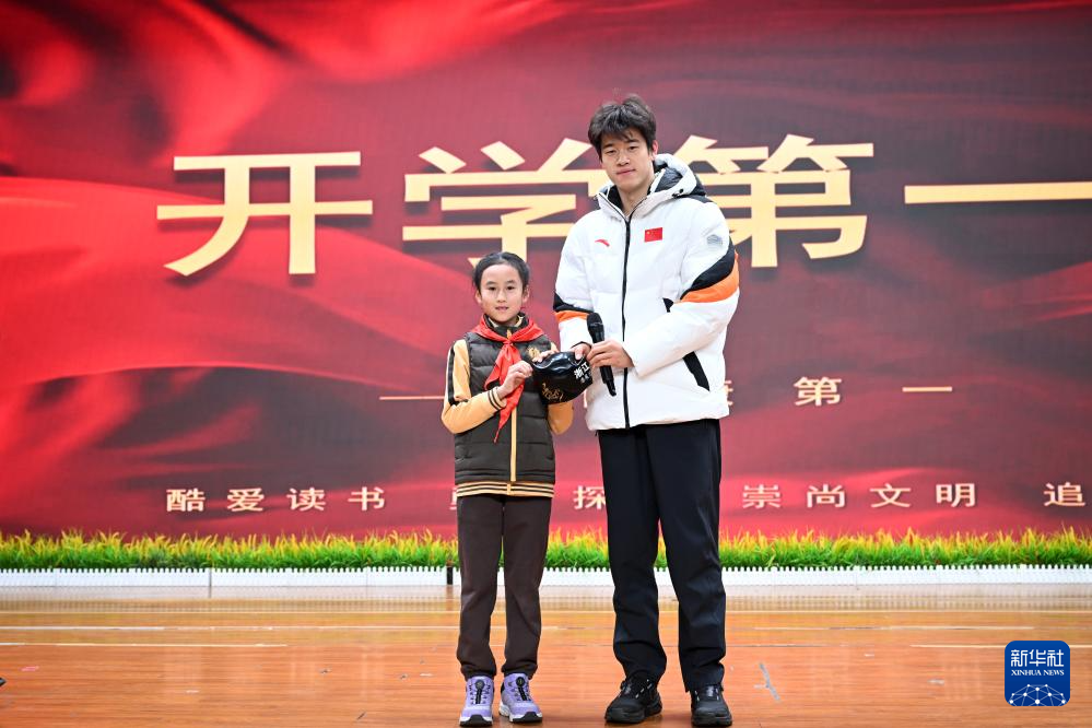 3月2日,北京第二实验小学以“勤励智耕 对己负责”为主题,举行新学期开学典礼。奥运冠军潘展乐受邀走进校园,带来“身心健康”为主题的开学第一课。这是潘展乐向学生代表赠送签名泳帽。