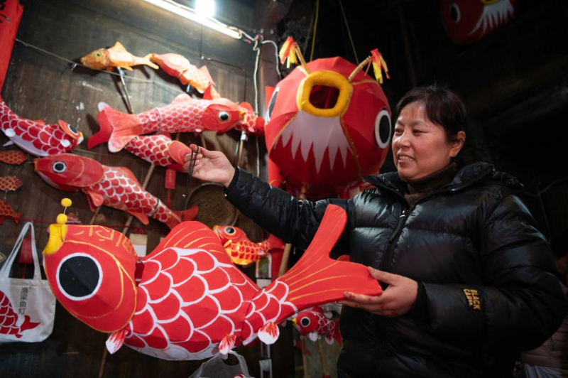 近日,在安徽省黄山市歙县徽城镇渔梁社区,渔梁鱼灯非遗传承人徐继丽在展示自己制作的鱼灯。新华社记者 张端 摄