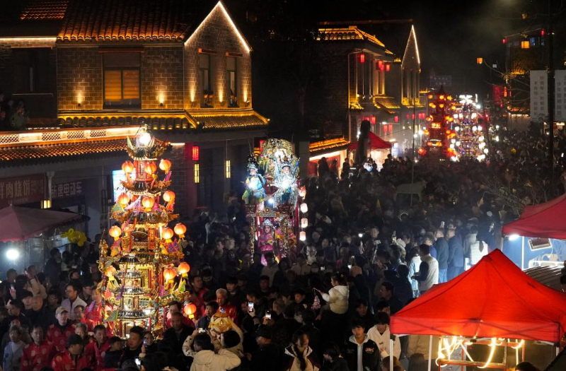 3月2日,浙江省宁海县前童古镇举行传统元宵行会,人们抬着鼓亭参加巡游。新华社记者 翁忻旸 摄
