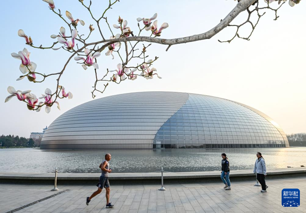3月12日,市民从国家大剧院旁的玉兰树下经过。