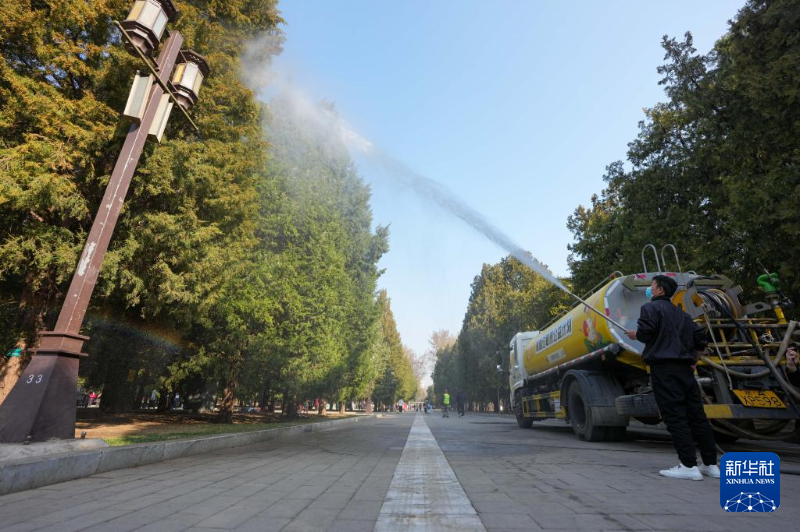 3月15日,在北京地坛公园,工作人员使用添加了花粉固定剂的水对柏树进行喷淋。