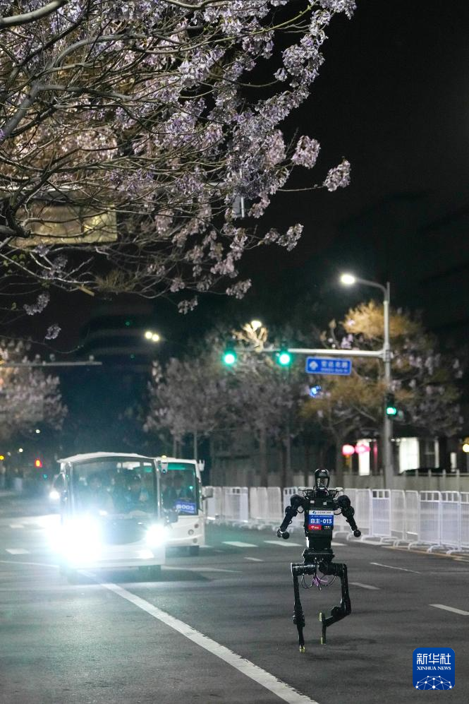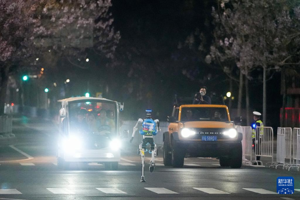 4月11日晚,一台机器人在测试活动中奔跑。 新华社记者 鞠焕宗 摄