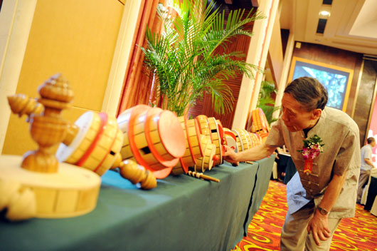 北京民俗学家王作楫欣赏在论坛现场展示的空竹