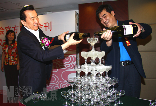 北京市邮政公司总经理章干泉与京报集团社长梅宁华共同为香槟塔注入香槟