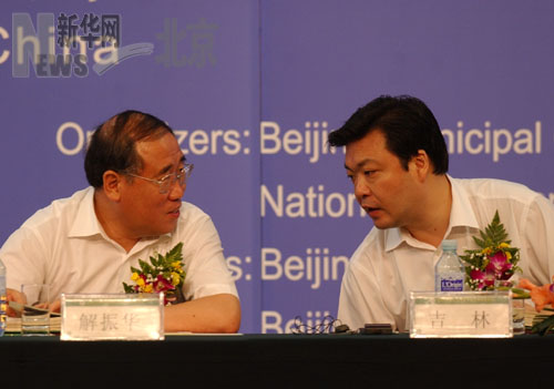 国家发展和改革委员会副主任解振华和北京市市委常委、常务副市长吉林交谈