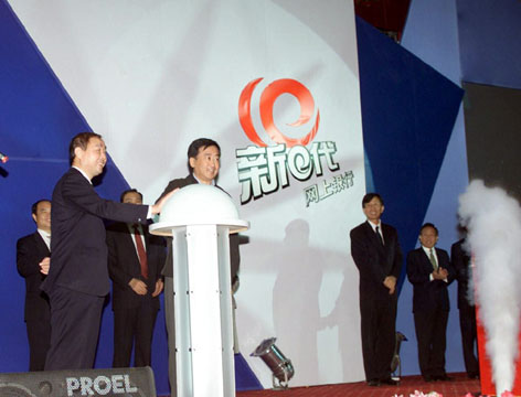 图为于丛林副局长与阎冰竹董事长一起启动新e代网上银行。