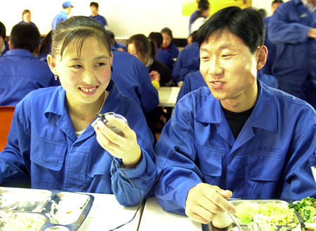 11月8日,张银涛、何静婵边吃午饭边听十六大的新闻,他们是联想集团北京厂的员工。