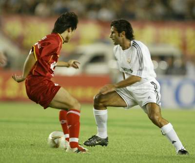 第32分钟,李玮峰踢倒菲戈,皇马得到任意球机会,贝克汉姆、菲戈、卡洛斯站在球前,卡洛斯又把机会让给了贝克汉姆,后者在左侧27米外右脚踢出弧线球,球从人墙缝隙中穿过稍稍偏出左门柱。第34分钟,齐达内脚后跟妙传,卡洛斯左侧回敲,齐达内在禁区边缘右脚射门偏出远门柱。