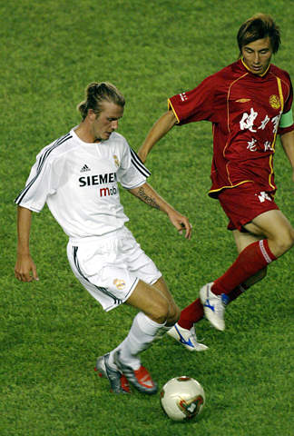 第16分钟,杨晨右路带球策动反击,菲戈在身后使绊将杨晨放倒。第18分钟,周挺右肋传过顶球,埃尔格拉禁区内头球解围。第20分钟,卡洛斯中路强行突破被申思绊倒,他将任意球机会让给了贝克汉姆,贝克汉姆在门前25米处主罚任意球,球越过人墙但角度比较正,孙刚向左鱼跃将球击出。